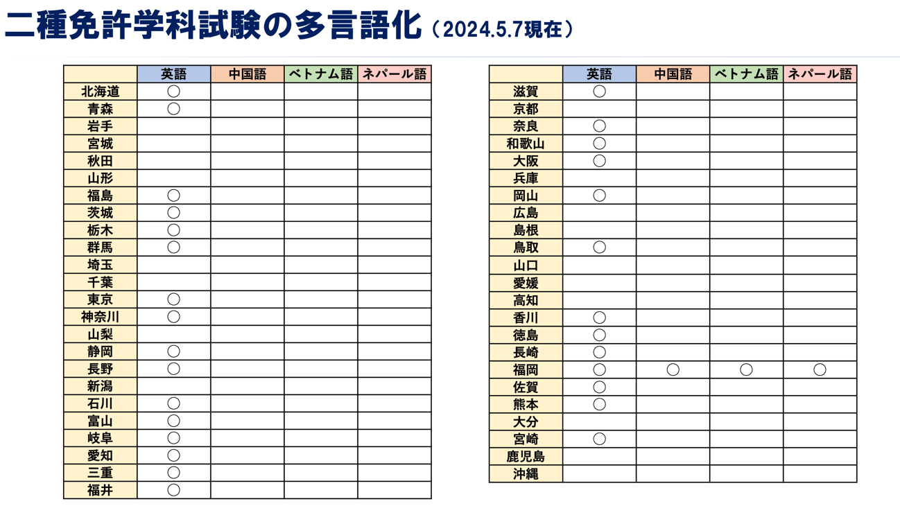 Until now, the academic test for the Type 2 license was only available in Japanese. The National Police Agency has decided to conduct the academic test in multiple languages so that foreigners can more easily obtain the Type 2 license. Therefore, by March 2024, they have decided to distribute examples of multi-language translated academic test questions for the Type 2 license to prefectural police departments in the following 20 languages.